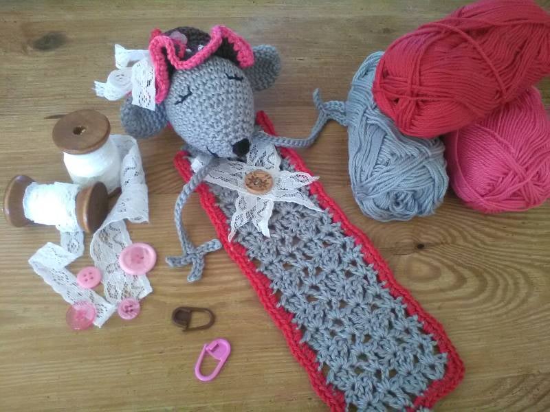 Deze muizenboekenlegger is ook op verzoek gemaakt. Dit keer vroeg ik naar de favoriete kleuren en dat waren bruin, roze en rood. En wat is het een mooie muis geworden! Ik heb me flink uitgeleefd op de muts en heb, in twee bruintinten, een houten knoopje op de voorkant van het kanten 'sjaaltje' bevestigd.