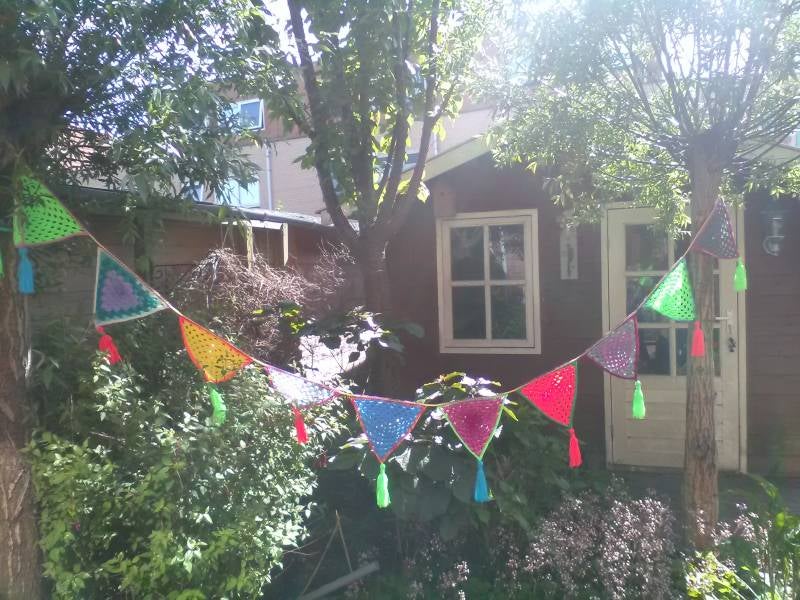 Deze klant was zo enthousiast over de originele 'Fransze Confetti' vlaggenlijn dat ze twee extra vlaggenlijnen bestelde. Of het met Neon accenten kon. Toen ik een adres met prachtige neonwol had gevonden kon ik doorgeven dat dat inderdaad mogelijk was. Twee exemplaren moesten er komen. Eentje met roze-gele accenten en eentje met groen-oranje. En of het aantal vlaggen ook wat meer kon zijn en o ja, of de vlaggetjes ook wat groter konden worden. Dat is het mooie van handgemaakte spullen op bestelling: U vraagt, wij draaien. De eerste is inmiddels af en ik vind hem prachtig geworden. De vlaggen hebben een zijkant van 26 cm gekregen en de totale lijn is, plat op de grond, bijna 10 meter. Om het extra gewicht wat op te vangen heb ik langs de bovenkant een extra toer halve vasten gehaakt en die ben ik geëindigd met een grappig rood bloemetje. Al met al ben ik zeer tevreden. Op naar nummer twee! Met speciale dank aan mijn ouders die hun tuin beschikbaar stelden voor een heuse 'fotoshoot' ;-) Op de foto is helaas het neon-effect niet goed zichtbaar maar geloof me: het geel en roze knalt je tegemoet!